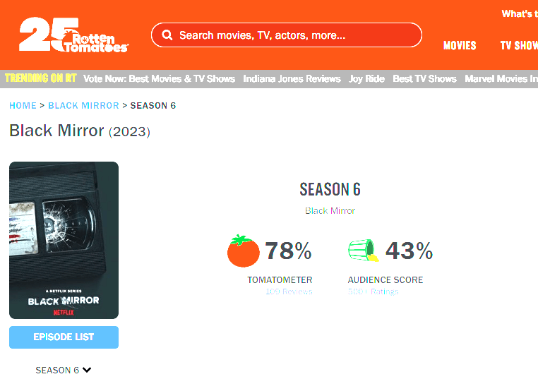 Essa relação temática quase óbvia entre o nome da série e a tecnologia talvez explique o sucesso relativamente baixo alcançado pela nova temporada, a sexta, lançada no último dia 15 de julho, entre os cerca de 230 milhões de assinantes do serviço de streaming. A Netflix costumeiramente se esquiva de divulgar números brutos de audiência, mas o julgamento feito pelos críticos e pelos espectadores em serviços como Metacritic e Rotten Tomatoes deixa pouca margem para dúvida.