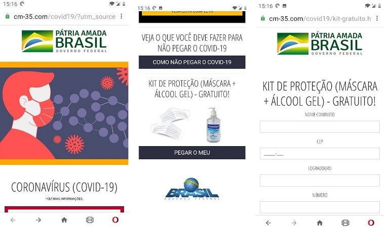 A mensagem maliciosa direciona os usuários para um site que promete informações sobre a atual situação da crise de saúde no País e um kit gratuito com máscara e álcool gel, a ser dado pelo governo federal.