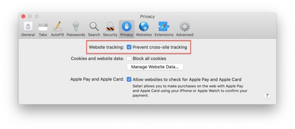 O ITP é controlado por um único botão liga / desliga – é o padrão – encontrado em Preferências, sob o ícone Privacidade. Se a caixa Rastreamento de site: estiver marcada para Impedir rastreamento entre sites, o ITP estará ativado.