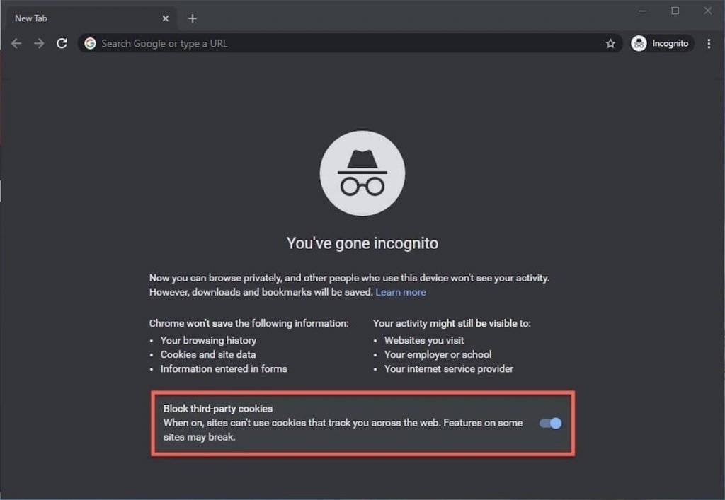 Uma adição recente à caixa de ferramentas do incógnito mudou essa tela introdutória. Na parte inferior da tela, há uma alternância – está ativada por padrão – junto com o texto que indica que os cookies de terceiros serão bloqueados enquanto estiver no modo de privacidade.