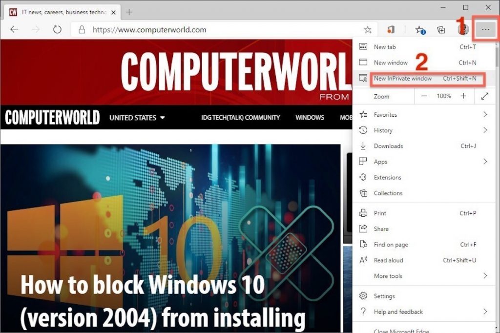 Uma maneira mais lenta de chegar lá é clicar no menu no canto superior direito – são três pontos organizados horizontalmente – e escolher a janela Nova InPrivate no menu.