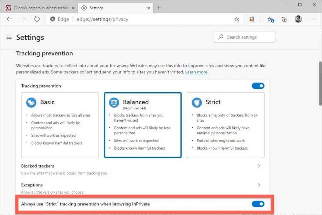 Embora a Microsoft tenha baseado o Edge no Chromium, o mesmo projeto de código aberto que vem com o código para alimentar o Chrome, a empresa de Redmond, Washington, integrou o anti-rastreamento em seu navegador, algo que o Chrome ainda precisa fazer. Apelidada de Prevenção de rastreamento, a função roda nos modos padrão do Edge e InPrivate.