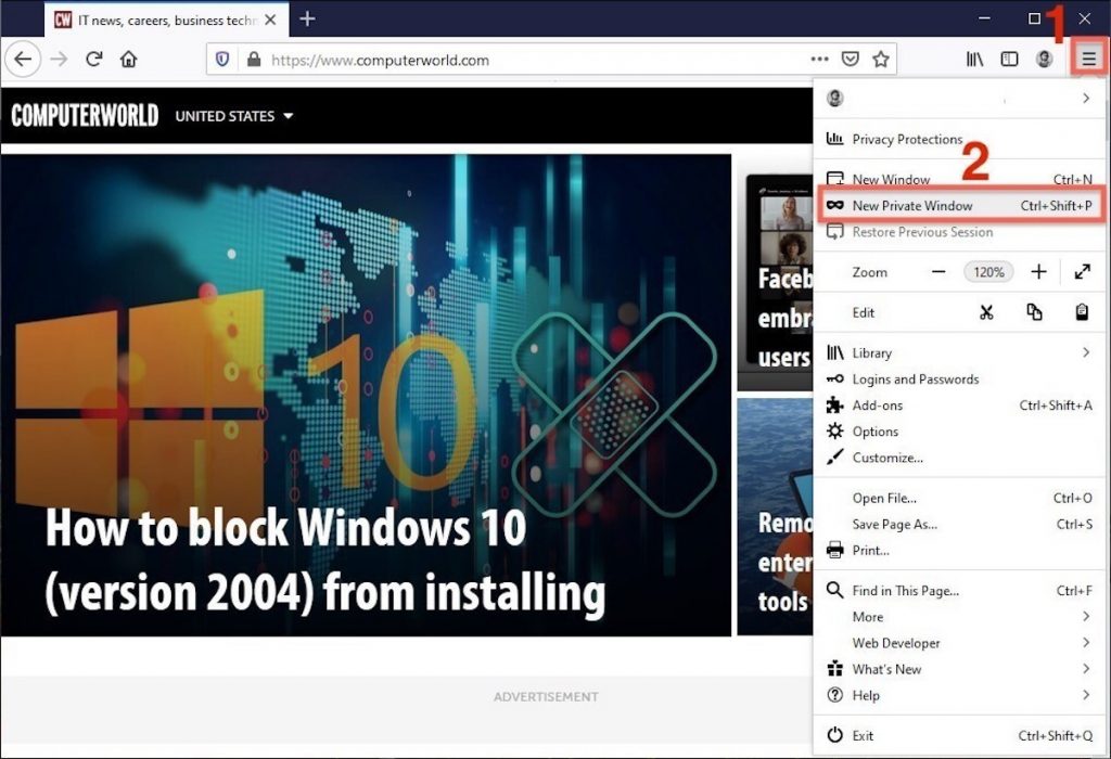 Caso contrário, uma janela pode ser aberta selecionando o menu Arquivo e clicando em Nova Janela Privada.