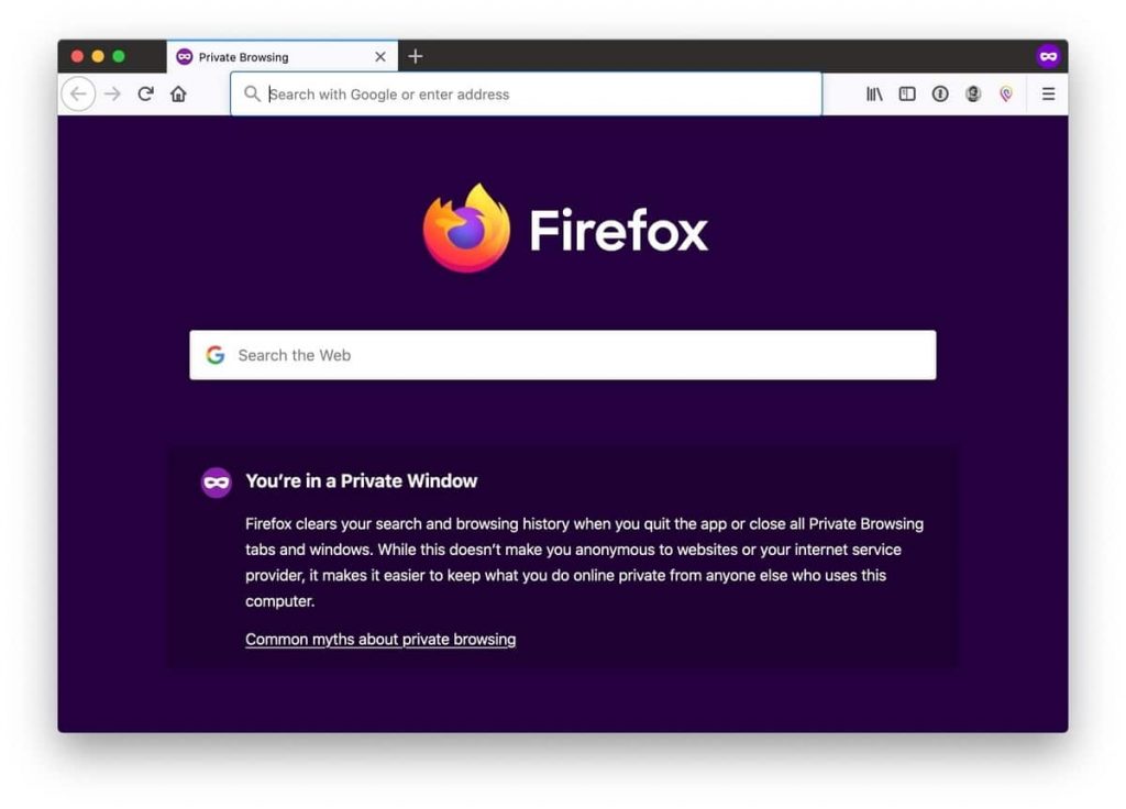 Uma janela de sessão privada é marcada pelo ícone com uma máscara roxa à direita da barra de título do quadro do Firefox. No Windows, o ícone está à esquerda dos botões minimizar / maximizar / fechar; em um Mac, a máscara fica na extremidade direita da barra de título.