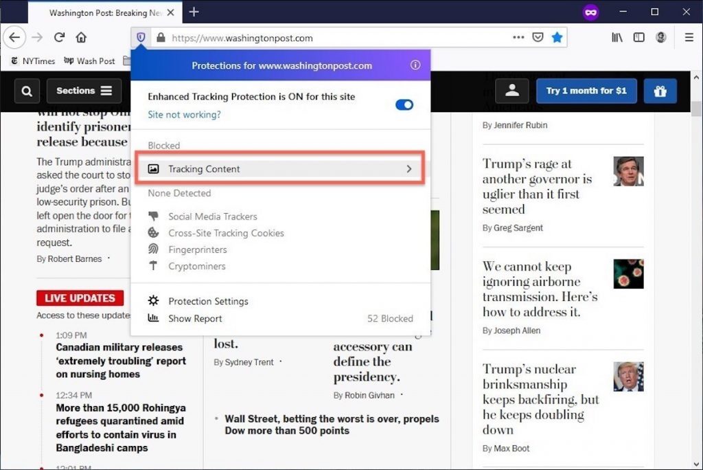 Como a proteção aprimorada contra rastreamento aprimorada é ativada por padrão no Firefox, não importa qual das suas configurações – Padrão, Rigorosa ou Personalizada – está selecionada na navegação privada; tudo o que pode ser bloqueado será bloqueado.