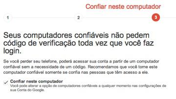 Depois disso, em poucos segundos você deverá receber uma mensagem de texto com um código. Digite-o na página e clique em Verificar. A seguir você pode definir seu computador como sendo “confiável”, ou seja, uma máquina a partir da qual você pode fazer o login sem precisar de um código de verificação. Só habilite esta opção em seus computadores pessoais. Clique em Próximo, e na página seguinte no botão Confirmar. Pronto! A autenticação em duas etapas está ativada.
