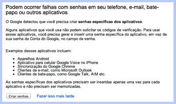Como já dissemos, alguns aplicativos não suportam autenticação em duas etapas e códigos de verificação. Se você usa um programa de e-mail (como o Thunderbird) para ler suas mensagens do Gmail, por exemplo, ou aplicativos que acessam o Google Reader e o Google Calendar, ou mesmo um smartphone Android integrado à sua conta Google, precisará configurar senhas especiais para cada um deles.