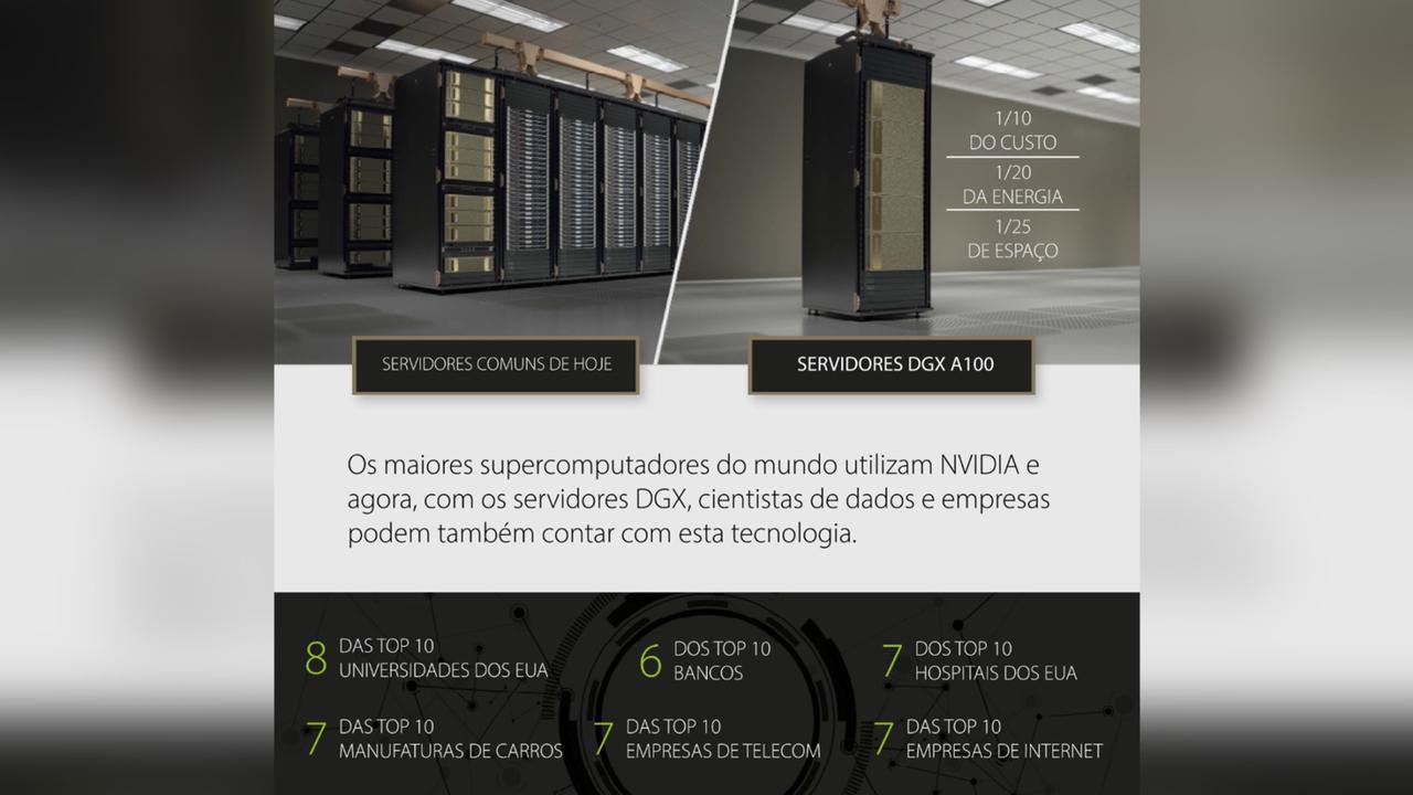 Com NVIDIA DGX™, primeiro sistema desenvolvido para lidar com cargas de IA no mundo, você se conecta no presente com o futuro da computação! Estas soluções aumentam a produtividade e ainda reduzem custos de infraestrutura e manutenção: quanto mais você compra, mais você economiza.