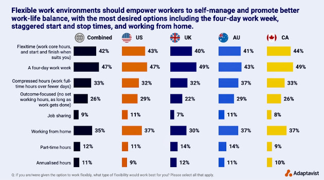 A pesquisa do provedor de software e serviços de negócios Adaptavist descobriu que 58% dos trabalhadores querem eliminar a semana de trabalho de 40 horas, e quase metade (47%) acredita que a melhor opção de trabalho flexível seria uma semana de trabalho de quatro dias. Mais um em cada quatro entrevistados (28%) também disse que seu empregador já oferece uma opção de semana de trabalho de quatro dias.