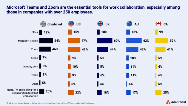 Além de onde e como os trabalhadores fazem seu trabalho, a pesquisa também perguntou quais plataformas de colaboração os funcionários não poderiam viver sem. Mais da metade dos entrevistados escolheu o Microsoft Teams (54%), em comparação com o Zoom (46%) e o Slack (12%).