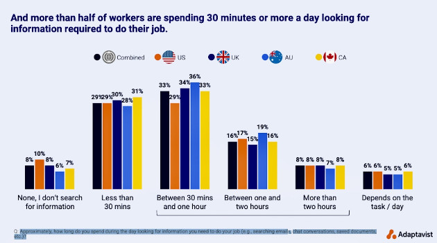 Quando perguntados sobre quanto tempo eles perdem procurando informações para fazer seu trabalho (como pesquisar em e-mails, conversas de bate-papo e documentos salvos), mais da metade disse pelo menos 30 minutos. Cerca de 17% indicaram passar até duas horas por dia buscando informações para realizar seu trabalho.